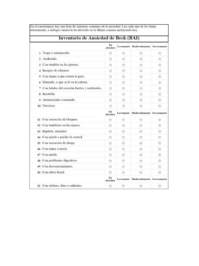 Below is a list of common symptoms of anxiety. Please carefully read each item in the list. Please carefully read each item in the list. Beck and his colleagues, the bai helps in identifying the presence and severity of anxiety in individuals, distinguishing it from depression. Beck anxiety inventory (bai) below is a list of common symptoms of anxiety.