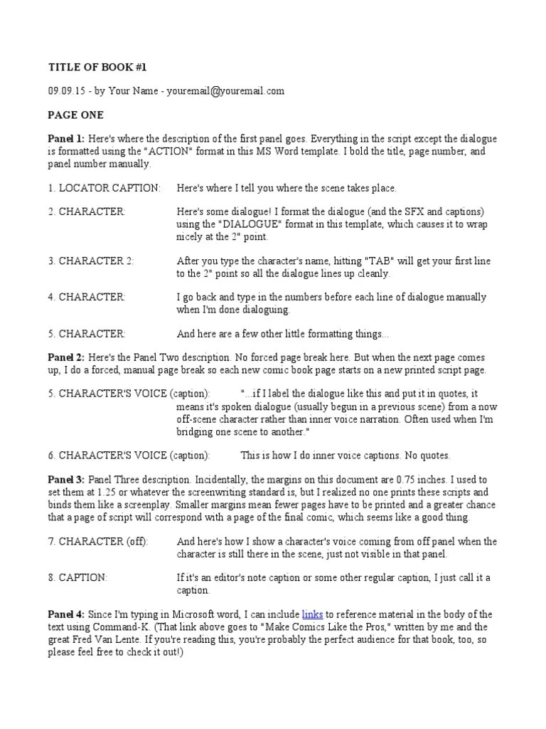 You’ll note the only camera declaration. There are a number of sample pages in the working writer’s guide to comics and graphic novels, but i’ll drop a page of a recent project below. From time to time, folks have asked me for a format template for writing a comic book script. I finally took a few minutes to prep one.