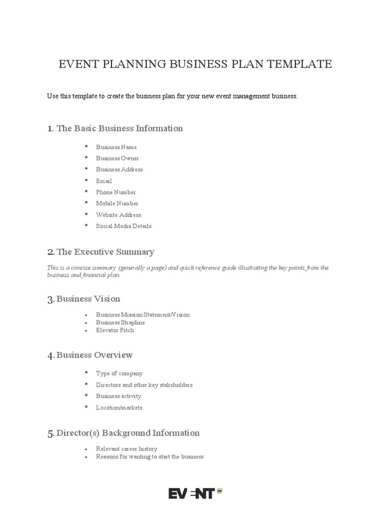Customize it to your needs and use it to apply for a loan or pitch to investors. Are you about starting an event management business? Use this free event planning business plan template to quickly & easily create a great business plan to start, grow and/or raise funding for your business. Download a free event planning business plan template to.